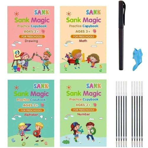 Specification: GELANI Magic Practice Copy Books Set of 4 Magic Writing & Drawing Books Kit Calligraphy Books for kids Alphabets for Kids Learning Handwriting Practice Copybook for Kids With Pen set for Preschooler
